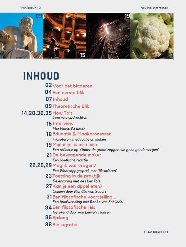 Een unieke uitgave van het vakblad Theater Blik, een tijdschrift waarin het onderwerp ‘filosoferen als maakstrategie' centraal staat. De initiatiefnemer van deze editie, Ronald ter Telgte, heeft zich hierin verdiept. Dit tijdschrift is in samenwerking met theatermakers, schrijvers, onderzoekers en andere vakmensen samengesteld. Het tijdschrift is met name gericht op collega theatermakers, docenten, al jaren in het werkveld of nog in opleiding.